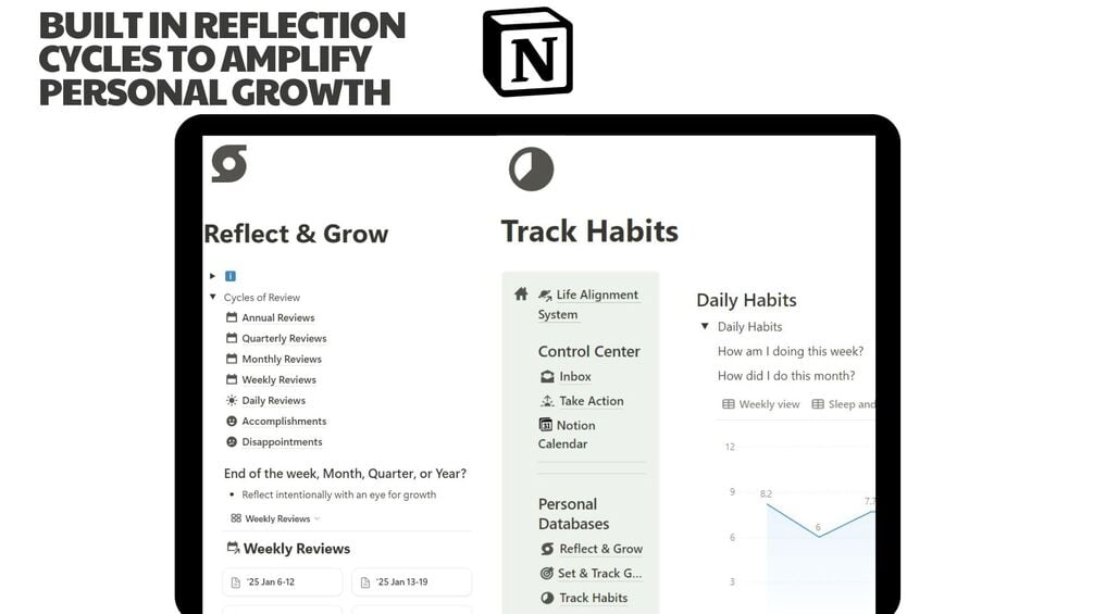 With the Notion Life Alignment System, you will receive extra built-in reflection questions and an outline to help you set guiding principles. This will not only help you organize your life, but actually start growing towards the person you want to become.